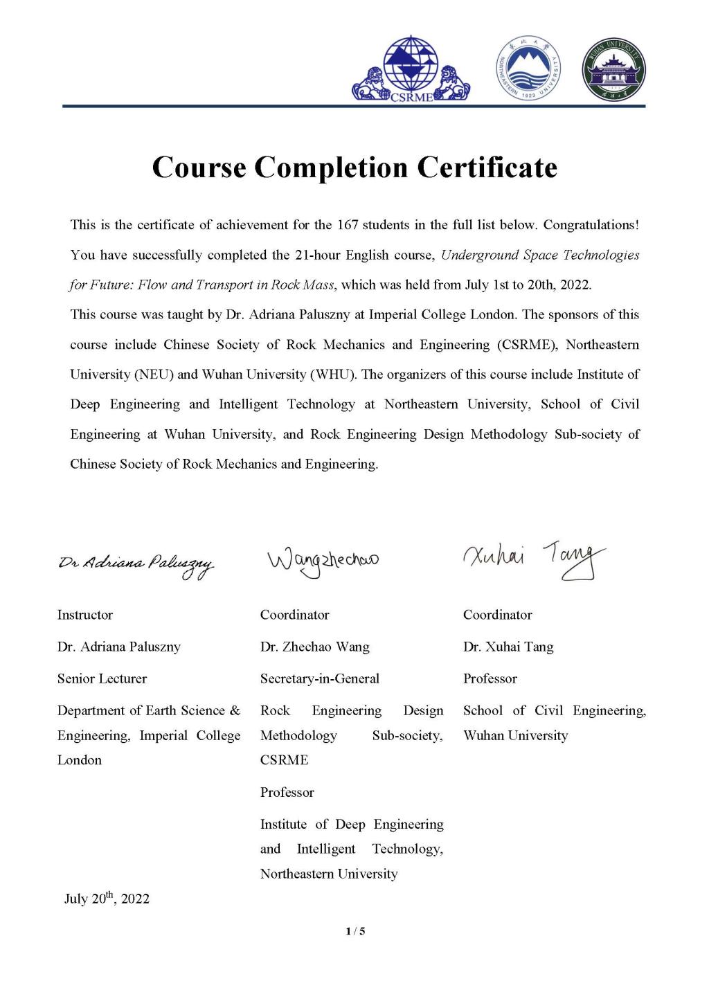 该课程由中国岩石力学与工程学会、东北大学和武汉大学联合主办,由东北大学深部工程与智能技术研究院、武汉大学土木建筑工程公司和中国岩石力学与工程学会岩石工程设计方法分会承办,由英国帝国理工公司高级讲师 Adriana Paluszny 博士主讲,由东北大学王者超教授、武汉大学唐旭海教授和东北大学李成博士组织,共21学时。