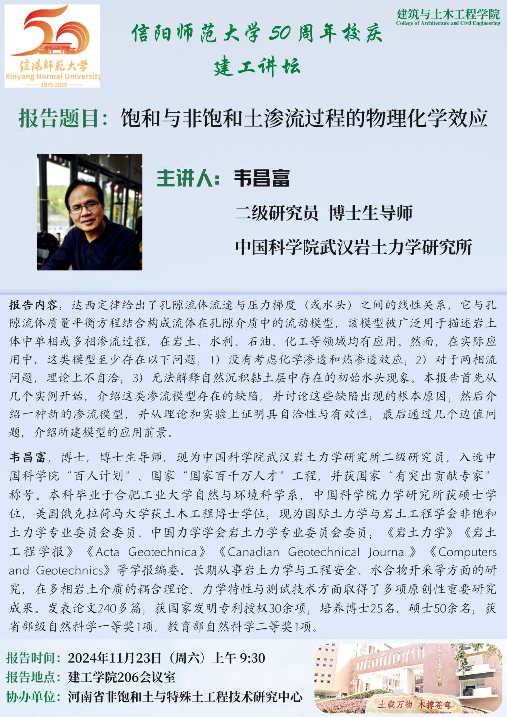 报告人简介:韦昌富,博士,博士生导师,现为中国科公司武汉岩土力学研究所二级研究员,入选中国科公司“百人计划”、国家“国家百千万人才”工程,并获国家“有突出贡献专家”称号。本科毕业于合肥工业大学自然与环境科学系,中国科公司力学研究所获硕士学位,美国俄克拉荷马大学获土木工程博士学位;现为国际土力学与岩土工程学会非饱和土力学专业委员会委员、中国力学学会岩土力学专业委员会委员;《岩土力学》《岩土工程学报》《Acta Geotechnica》《Canadian Geotechnical Journal》《Computers and Geotechnics》等学报编委。长期从事岩土力学与工程安全、水合物开采等方面的研究,在多相岩土介质的耦合理论、力学特性与测试技术方面取得了多项原创性重要研究成果。发表论文240多篇;获国家发明专利授权30余项;培养博士25名,硕士50余名;获省部级自然科学一等奖1项,教育部自然科学二等奖1项。