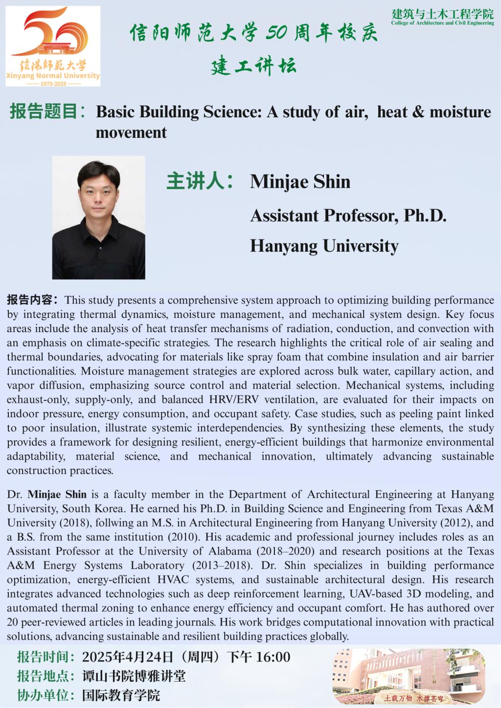 报告人简介:Dr. Minjae Shin is a faculty member in the Department of Architectural Engineering at Hanyang University, South Korea. He earned his Ph.D. in Building Science and Engineering from Texas A&M University (2018), follwing an M.S. in Architectural Engineering from Hanyang University (2012), and a B.S. from the same institution (2010). His academic and professional journey includes roles as an Assistant Professor at the University of Alabama (2018–2020) and research positions at the Texas A&M Energy Systems Laboratory (2013–2018). Dr. Shin specializes in building performance optimization, energy-efficient HVAC systems, and sustainable architectural design. His research integrates advanced technologies such as deep reinforcement learning, UAV-based 3D modeling, and automated thermal zoning to enhance energy efficiency and occupant comfort. He has authored over 20 peer-reviewed articles in leading journals. His work bridges computational innovation with practical solutions, advancing sustainable and resilient building practices globally.