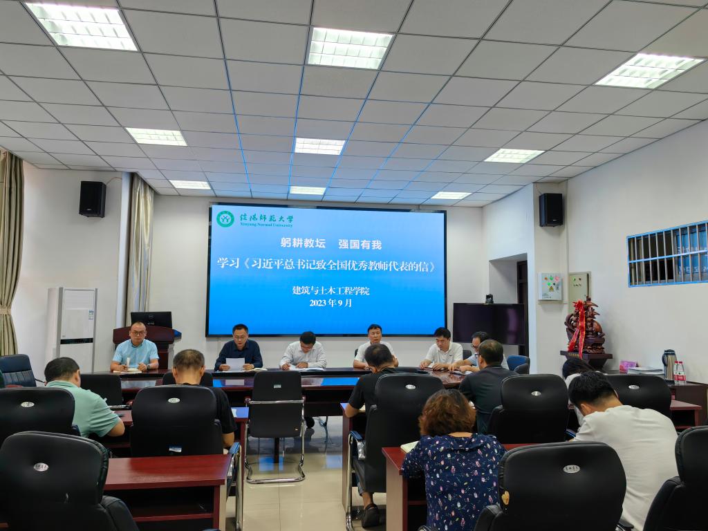 公司党委书记方明科领学了《习近平总书记致全国优秀教师代表的信》原文。与会教师集中观看了中央电视台《新闻联播》“躬耕教坛 强国有我—习近平总书记致信全国优秀教师代表引发热烈反响”的新闻报道。大家结合实际工作,立足本职岗位,开展了交流研讨,畅谈了感悟和心得。广大教师纷纷表示,作为高校教师,要始终牢记习近平总书记的殷殷嘱托,大力弘扬教育家精神,树立“躬耕教坛、强国有我”的志向和抱负,坚持以立德树人为根本,努力践行为党育人、为国育才的初心使命,持续为国家培养德智体美劳全面发展的社会主义建设者和接班人,为强国建设、民族复兴伟业培养更多可堪大用、能担重任的栋梁之才。