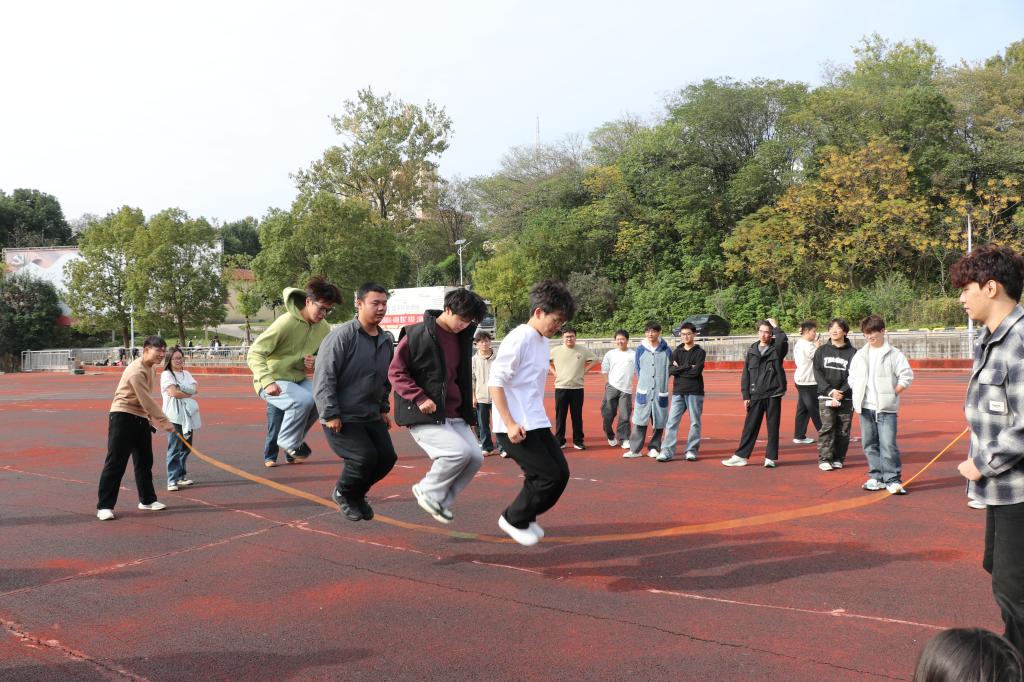 运动会现场气氛热烈,活动项目丰富多样、高潮迭起:旱地龙舟比赛中,各小队骑在色彩鲜艳的充气龙舟上,“一二一”的号子声整齐划一,在步伐由杂乱到统一的进程中迅速拉近了彼此的距离;无敌旋风跑比赛中,队员们手拉手如一道旋风般绕标旋转,成为操场上一道流动的风景;集体拔河比赛中,队员们面庞通红却目光坚定,绳索在双方拉锯中紧绷,震天的呐喊声将集体的凝聚力诠释得淋漓尽致;多人跳绳比赛中,长绳划出优美弧线,同学们看准时机、鱼贯而入,身轻如燕的身影伴随着成功的欢叫与偶尔失误的善意笑声;摸石过河比赛中,队员们灵活地移动脚下的“砖石”,在追求速度与保持平衡间寻找最佳策略;袋鼠跳比赛中,同学们套在五彩跳跃袋中奋力前蹦,憨态可掬的模样与拼搏向前的精神交织,引得场边笑声与掌声不断。整场活动既有紧张激烈的竞技角逐,更有轻松愉快的合作氛围,掌声、笑声、助威声此起彼伏,汇成一片欢乐的海洋,让同学们在身体力行中深刻体会到团结协作的力量,充分展现了建工学子朝气蓬勃、活力四射的青春风采。