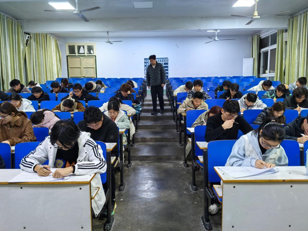 考场上秩序井然,同学们认真作答,展现出良好的精神风貌。本次考试旨在增强员工纪律观念,促进优良学风建设,为文明校园建设奠定基础。