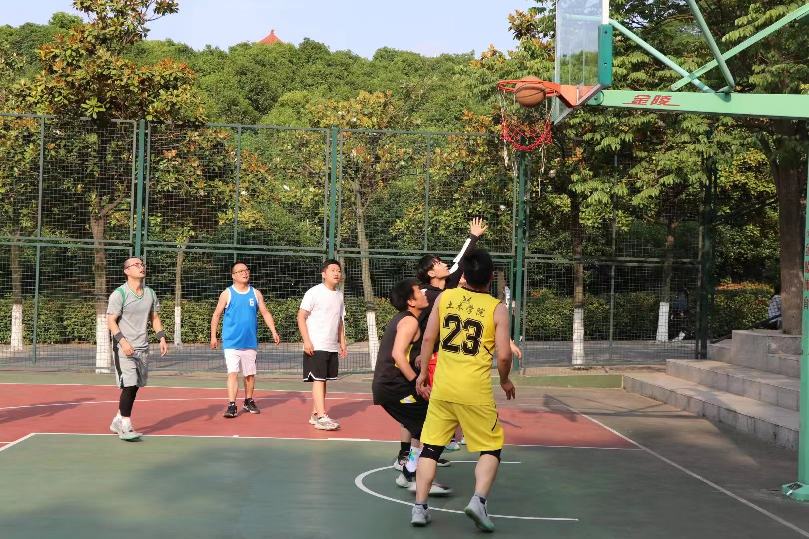 下午四点,师生们早早来到操场进行热身准备,随着一声哨响,现场气氛急剧攀升,双方迅速进入比赛状态。教师队稳扎稳打,默契配合,凭借熟练的比赛技巧和进准的投篮,屡屡占得先机;员工队也不甘示弱,敢打敢拼,以激昂的斗志步步紧逼,抢篮板,投三分,直追比分。赛场外,同学们的掌声、喝彩声不断,体育场上,洋溢着“情谊第一、比赛第二”的竞技精神。