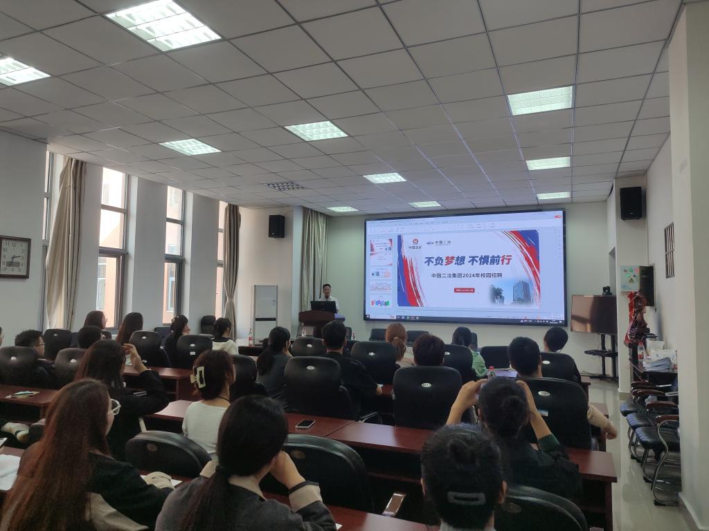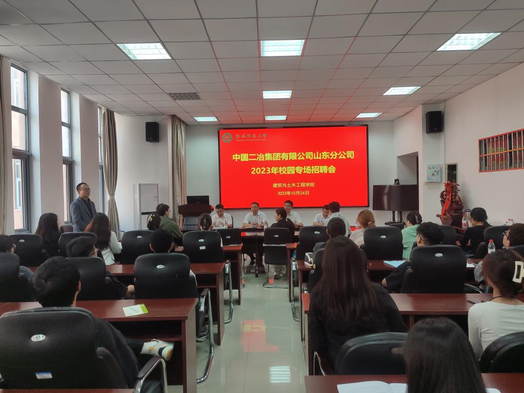 10月24日下午,中国二冶集团有限公司山东分公司在综合实验楼召开专场招聘会。公司党委副书记冀鹏、就业秘书邓林、2024届毕业生40余人参会。