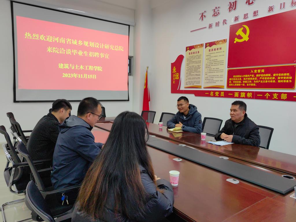 11月15日下午,河南省城乡和规划设计研究总院股份有限公司交通院经理吴黎、总工董君来院对接2024届毕业生招聘事宜。建筑与土木公司党委副书记冀鹏与吴黎一行在综合实验楼南楼402会议室进行了座谈。