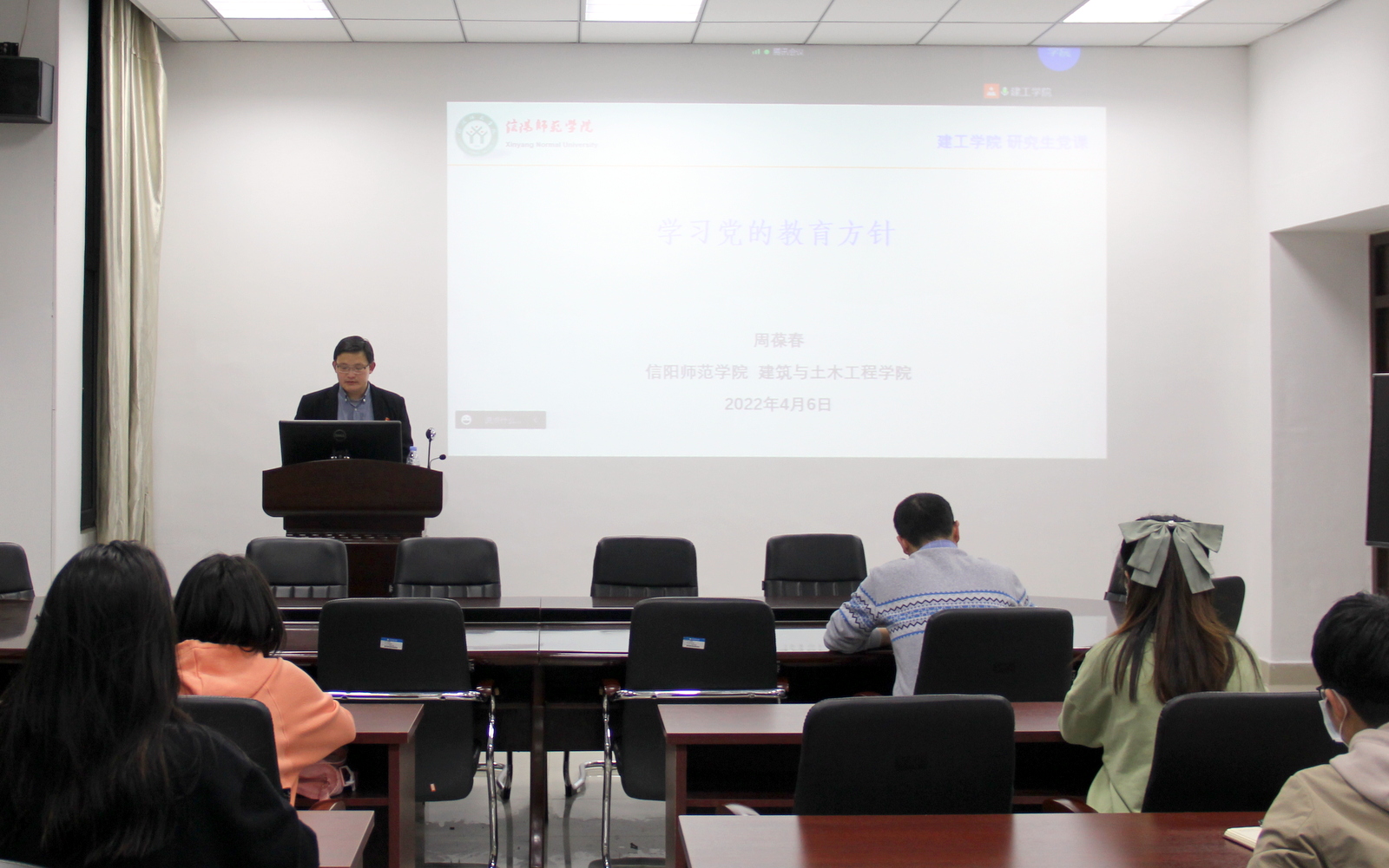 2022年4月6日晚上,365英国上市公司经理、河南省高等公司优秀共产党员周葆春同志在综合实验楼206室为研究生上党课,学习党的教育方针,研究生班主任马文强和全体研究生线下线上参加本次活动。